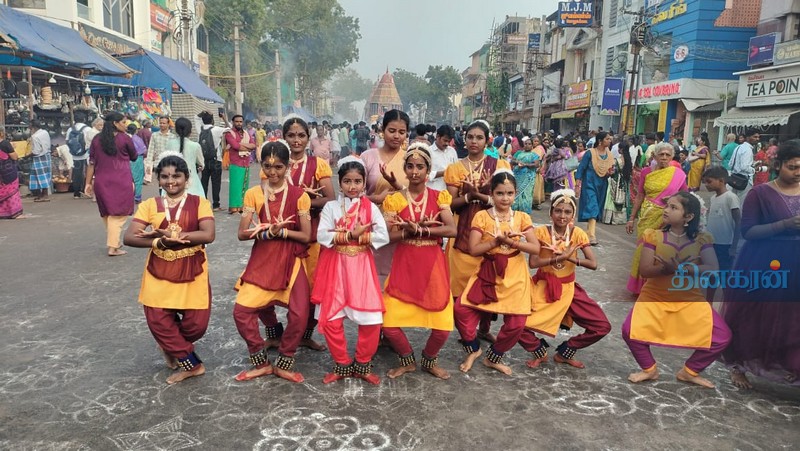 பெண்கள் தேருக்கு முன்னால் சாலையில் கோலமிட்டபடி சென்றனர். சிவாச்சாரியார்கள் சிவ வாத்திய கருவிகளை இசைத்தபடியும், சிவ நடனம் ஆடியபடியும் தேருக்கு முன்பாக வலம் வந்தனர். சிறுமிகள் மற்றும் சிறுவர்கள் சிலம்பாட்டம் ஆடியபடி வந்தனர். சிறுமிகள் பலர் தேருக்கு முன்பாக தேரோடும் வீதிகளில் பரதநாட்டியம் ஆடினர். பக்தர்கள் வடம் பிடித்து தேர் இழுத்தனர்