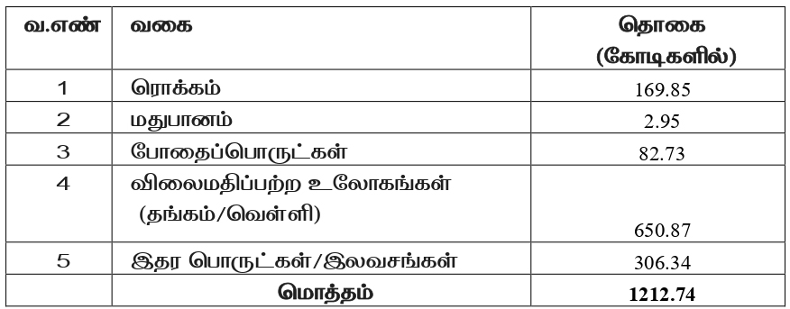 4. அனைத்து சட்டமன்றத் தொகுதிகளிலும் ஈடுபடுத்தப்பட்டுள்ள கண்காணிப்புக் குழுக்கள், 24×7 நேரமும் தீவிரமாகக் கண்காணிப்புப் பணியில் ஈடுபட்டுள்ளன. 20.04.2026 அன்றைய நிலவரப்படி, இக்குழுக்களால் கைப்பற்றப்பட்ட பொருட்களின் விவரங்கள் கீழே கொடுக்கப்பட்டுள்ளன.
