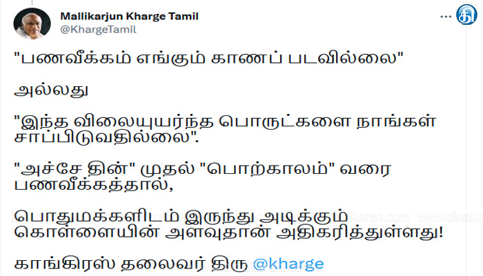 கொடிய பணவீக்கம் விகிதத்தால் கடந்த 9 ஆண்டுகளில் மக்களின் சம்பாத்தியத்தை பாஜக அரசு கொள்ளையடித்து விட்டதாக காங்கிரஸ் கட்சி சாடியுள்ளது. அத்தியாவசியமான அனைத்தின் மீதும் ஜி.எஸ்.டி. பாதிப்பை ஏற்படுத்தி விட்டது என்றும் அத்துடன் பட்ஜெட்டை பாழாக்கி வாழ்க்கையை கடினமாக்கி விட்டதாகவும் அந்த டிவிட்டர் பதிவில் கூறப்பட்டுள்ளது. இந்த அரசு அச்சே-தின் என்ற நல்ல நாளில் தொடங்கி அமிர்தமான நேரத்தை நோக்கி செல்வதாகவும் காங்கிரஸ் கட்சி கிண்டல் செய்துள்ளது.