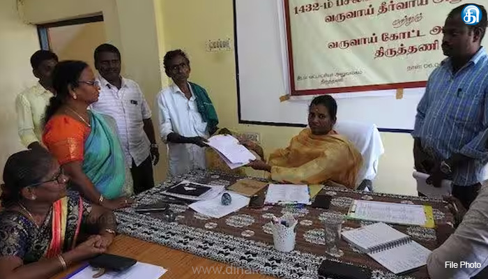 அப்போது அவருடன் நகர திமுக துணைச் செயலாளர் கணேசன், முன்னாள் கவுன்சிலர்கள் வீரவால் பழனி, ரவி ஆகியோர் இருந்தனர். இந்த மனுவை பெற்றுக்கொண்ட ஜமாபந்தி அலுவலர் தீபா, உடனடியாக துறைவாரியாக நடவடிக்கை எடுப்பதாக உறுதி அளித்தார். இந்த நிகழ்ச்சியில் வருவாய் ஆய்வாளர் கமல், குறுவட்ட சர்வேயர் கோவிந்தராஜ், கிராம நிர்வாக அலுவலர்கள் ராஜலட்சுமி, சுதாகர், கௌரி, உமா, டில்லி பாபு, ஜோதி, உதவி வேளாண்மை அலுவலர் சீனிவாசன் உள்பட பலர் கலந்து கொண்டனர்.