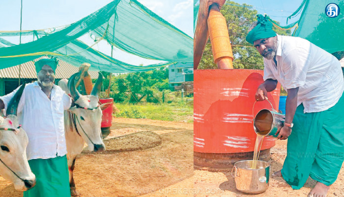 அப்போதுதான் தேங்காயை எண்ணெயாக மதிப்புக்கூட்டினால் என்ன? என்று யோசித்தேன். நாம் செய்வது இயற்கை விவசாயம். இதில் இருந்து எண்ணெய் எடுத்தால் மக்களிடம் நல்ல வரவேற்பு இருக்கும் என நினைத்து அதை நடைமுறைப்படுத்த தொடங்கிவிட்டேன். எண்ணெயை இயந்திரம் மூலம் பிழியக்கூடாது நமது பாரம்பரியமிக்க நல்வாகை கல் செக்கை அமைக்க வேண்டும் என அதை அமைத்தேன். அதில் காங்கேயம் மாடுகளை வைத்து இயக்கி எண்ணெய் எடுக்கிறேன். இப்படி மாட்டு கல்செக்கில் எண்ணெய் ஆட்டும்போது கொஞ்சம் கூட எண்ணெய் சூடாவதில்லை. இதனால் அதில் உள்ள உயிர்ச்சத்துக்கள் முழுமையாக அப்படியே இருக்கும். உணவும் ருசிக்கும், உடலுக்கும் ஆரோக்கியம். நல்லெண்ணெய் ஆட்டும்போது கருப்பட்டியும், தேவைக்கேற்ப வெல்லமும் சேர்க்கப்படுகிறது.