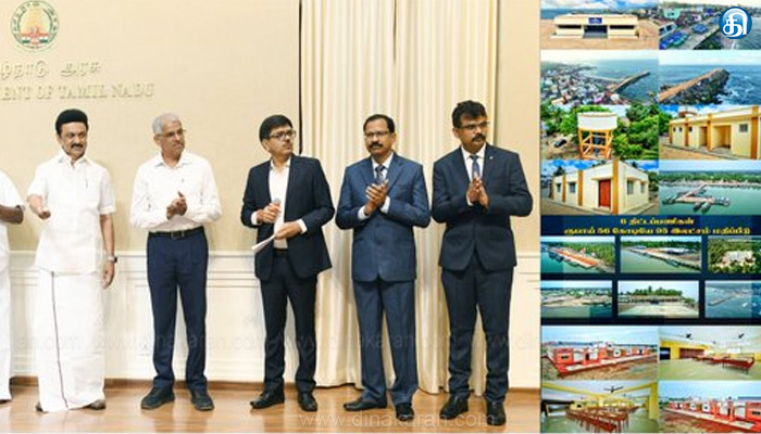 கன்னியாகுமரி மாவட்டம், குறும்பனையில் 30 கோடி ரூபாய் செலவில் மேம்படுத்தப்பட்ட மீன் இறங்கு தளம், தஞ்சாவூர் மாவட்டம், கீழத்தோட்டம் கிராமத்தில் 8 கோடி ரூபாய் செலவில் அமைக்கப்பட்டுள்ள புதிய மீன் இறங்கு தளம் மற்றும் சேதுபவாசத்திரம் மீனவ கிராமத்தில் 10 கோடி ரூபாய் செலவில் மேம்படுத்தப்பட்ட மீன் இறங்கு தளம், கிருஷ்ணகிரி மாவட்டம், பாரூரில் 4 கோடியே 50 இலட்சம் ரூபாய் செலவில் அமைக்கப்பட்டுள்ள மரபணு ரீதியாக மேம்படுத்தப்பட்ட திலேப்பியா (Genetically Improved Farmed Tilapia) மீன் விதைப் பண்ணை, புதுக்கோட்டை மாவட்டம், கோட்டைப்பட்டினம் கிராமத்தில் 3 கோடியே 5 இலட்சம் ரூபாய் செலவிலும், புதுக்குடி கிராமத்தில் 1 கோடியே 40 இலட்சம் ரூபாய் செலவிலும் அமைக்கப்பட்டுள்ள புதிய மீன் இறங்கு தளங்கள்.என மொத்தம் 56 கோடியே 95 இலட்சம் ரூபாய் செலவில் அமைக்கப்பட்டுள்ள புதிய மற்றும் மேம்படுத்தப்பட்ட மீன் இறங்கு தளங்கள் மற்றும் மீன் விதைப் பண்ணை ஆகியவற்றை மாண்புமிகு தமிழ்நாடு முதலமைச்சர் அவர்கள் திறந்து வைத்தார்.