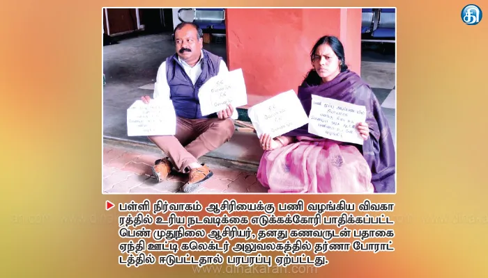 இந்த சூழலில் மனு குறித்து எவ்வித நடவடிக்கையும் எடுக்கப்படாத நிலையில் முதுநிலை ஆசிரியர் சத்தியவதி நேற்று மதியம் ஊட்டியில் மாவட்ட கலெக்டர் அலுவலக வளாகத்தில் தனது கணவருடன் சேர்ந்து கையில் பதாகை ஏந்திய படி தர்ணா போராட்டத்தில் ஈடுபட்டனர். உடனடியாக அங்கு வந்த ஊட்டி வட்டாட்சியர் சரவணகுமார், தர்ணா போராட்டத்தில் ஈடுபட்ட ஆசிரியர் சத்தியவதியுடன் பேச்சுவார்த்தை நடத்தினார். இந்த விவகாரத்தில் உரிய நடவடிக்கை எடுக்கப்படும் என தெரிவித்ததை தொடர்ந்து அவர் தர்ணா போராட்டத்தை கைவிட்டார். பின்னர், கலெக்டர் அலுவலக அதிகாரிகள் அவரிடம் விசாரித்தனர். இதனால் பரபரப்பு ஏற்பட்டது.