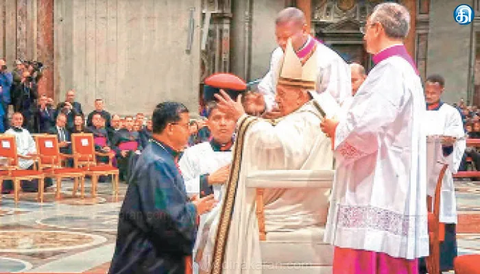 இந்த முக்கிய கார்டினல் பொறுப்பில் இந்தியாவில் இருந்து கேரளாவின் செங்கனாச்சேரியை சேர்ந்த மான்சிக்னார் ஜார்ஜ் ஜேக்கப் கோவாக்காட் (51) தேர்வு செய்யப்பட்டுள்ளார். இவரது பதவியேற்பு நிகழ்ச்சி நேற்று வாடிகனில் நடந்தது. ஜார்ஜ் ஜேக்கப் கோவாக்காட்டுக்கு போப் பிரான்சிஸ் பதவி பிரமாணம் செய்து வைத்தார். புகழ்பெற்ற செயின்ட் பீட்டர்ஸ் பசிலிக்காவில் நடைபெற்ற இந்த விழாவில், உலகெங்கிலும் உள்ள மதகுருமார்கள் மற்றும் முக்கிய பிரமுகர்கள் கலந்து கொண்டனர், மேலும் பல்வேறு நாடுகளைச் சேர்ந்த 21 புதிய கார்டினல்கள் நியமிக்கப்பட்டனர்.