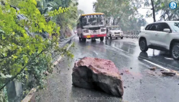 திருமலை: தொடர் மழை காரணமாக திருப்பதி மலைப்பாதையில் பாறை சரிந்து விழுந்ததால் பக்தர்கள் அதிர்ச்சி அடைந்தனர். திருப்பதி, திருமலையில் நேற்று முன்தினம் இரவு முதல் தொடர்ந்து மழை பெய்து வருகிறது. இந்நிலையில், திருப்பதியில் இருந்து திருமலைக்கு செல்லும் இரண்டாவது மலைப்பாதை 8வது கிலோ மீட்டர் தூரத்தில் உள்ள ஹரிணி நிழற்பந்தல் அருகே நேற்று மதியம் சுமார் 12.45 மணியளவில் பாறை ஒன்று திடீரென சரிந்து சாலையில் விழுந்தது. அதிர்ஷ்டவசமாக அந்த நேரத்தில் எந்த வாகனமும் செல்லாததால் பெரும் விபத்து தவிர்க்கப்பட்டது. ஆனால் போக்குவரத்து பாதிக்கப்பட்டது. இதுகுறித்து தகவல் அறிந்த தேவஸ்தான அதிகாரிகள் உடனடியாக அந்த பகுதிக்கு விரைந்து சென்று பாறையை அகற்றும் பணியில் ஈடுபட்டனர். மேலும் போக்குவரத்தையும் சரி செய்தனர். இதற்கிடையில் தொடர்ந்து மழை பெய்து வருவதால் மண் சரிவு ஏற்படுவதற்கான வாய்ப்புகள் இருப்பதால் வாகன ஓட்டிகள் எச்சரிக்கையுடன் செல்லுமாறு தேவஸ்தான நிர்வாகத்தினர் கேட்டுக் கொண்டனர்.