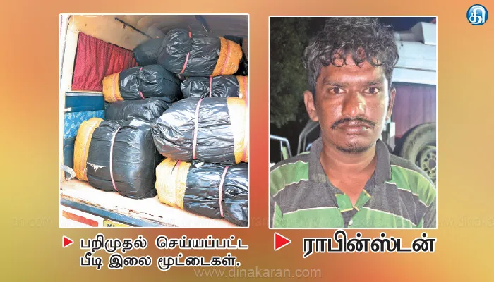 உடனடியாக அவர்களை போலீசார் சுற்றி வளைக்கவே ஒருவர் தப்பியோடினார். மற்றொருவர் போலீசாரிடம் சிக்கினார்.அங்கு நின்றிருந்த வேனை சோதனையிட்ட போது, அதில் தலா 30 கிலோ எடை கொண்ட ‘கட்டிங்’ பீடி இலை 29 மூட்டைகளும், 14 மூட்டைகளில் பீடி இலைகளும் என மொத்தம் 43 பீடி இலை மூட்டைகள் இருந்துள்ளன. இதன் மொத்த எடை 1.29 டன் ஆகும்.