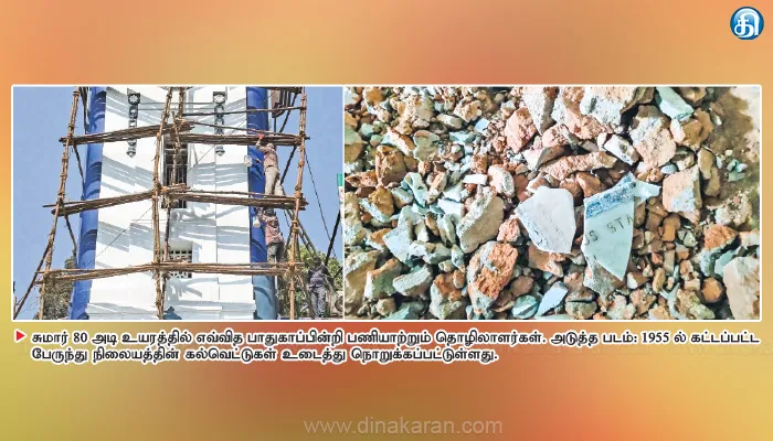 இந்நிலையில் பேருந்து நிலையத்தின் சீரமைப்பு பணிகளில் தற்போது வர்ணம் பூசும் பணிகள் நடைபெற்று வருகிறது. ஒப்பந்தம் அடிப்படையில் 20 க்கும் மேற்பட்ட தொழிலாளர்கள் பணியாற்றி வருகின்றனர். இதில் பேருந்து நிலைய கோபுரத்தின் மீது, சுமார் 80 அடி உயரத்தில் வர்ணம் பூசும் பணிகளில் 4 தொழிலாளர்கள் ஈடுபட்டு வருகின்றனர்.
