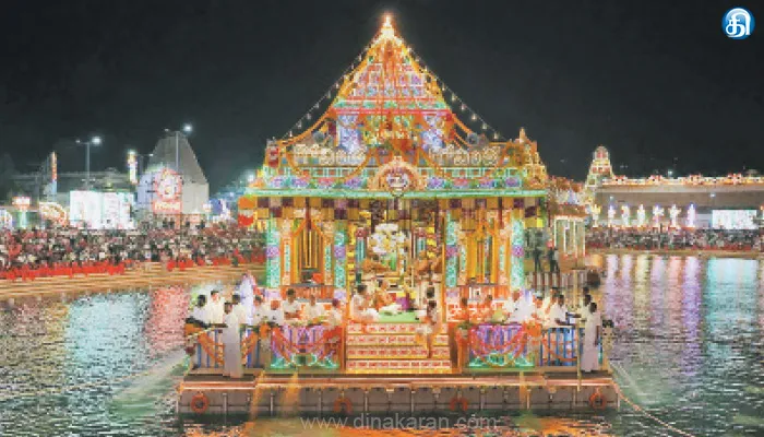 இதற்காக மின் விளக்குகள் மற்றும் மலர்களால் அலங்கரிக்கப்பட்டு தெப்பலில் சுவாமி 3 சுற்றுகள் தெப்பக்குளத்தை வலம் வந்து பக்தர்களுக்கு அருள்பாலித்தார். கோயில் தெப்பக்குளத்தை சுற்றி ஆயிரக்கணக்கான பக்தர்கள் திரண்டு கற்பூரம் ஆரத்தி எடுத்து தரிசனம் செய்தனர். மூன்றாம் நாளான இன்று முதல் மூன்று நாட்களுக்கு மலையப்பசுவாமி, தேவி, பூதேவி தாயாருடன் அலங்கரிக்கப்பட்ட தெப்பலில் எழுந்தருளி அருள்பாலிக்க உள்ளனர்.