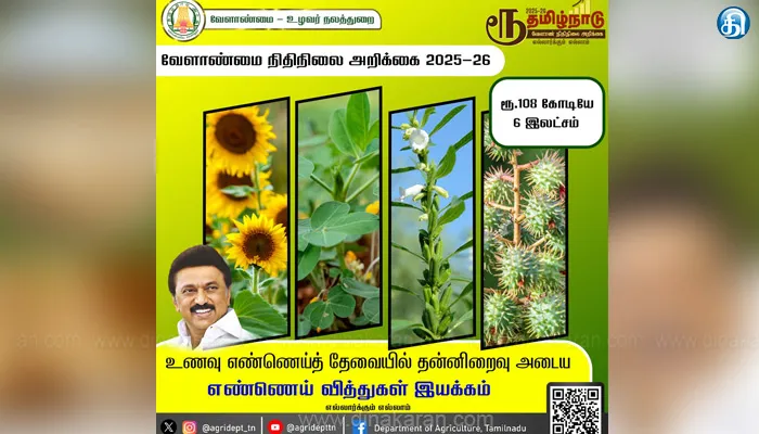 தமிழ்நாட்டில் நிலக்கடலை, எள், சூரியகாந்தி, ஆமணக்கு போன்ற பிரதான எண்ணெய்வித்து பயிர்கள் சராசரியாக 10 லட்சத்து 4 ஆயிரம் ஏக்கர் பரப்பளவில் சாகுபடி செய்யப்பட்டு வருகிறது. உணவு எண்ணெய் தேவையில் தன்னிறைவு அடையும் வகையில், நிலக்கடலை, எள், சூரியகாந்தி, ஆமணக்கு ஆகிய பயிர்களின் பரப்பினை அதிகரிக்கும் பொருட்டு, எண்ணெய் வித்துகள் இயக்கம், 2025-26ம் ஆண்டில் 2 லட்சத்து 16 ஆயிரம் ஏக்கர் பரப்பில் சுமார் 90 ஆயிரம் உழவர்கள் பயன்பெறும் வகையில் ரூ.108.6 கோடி ஒன்றிய, மாநில நிதி ஒதுக்கீட்டில் செயல்படுத்தப்படும்.