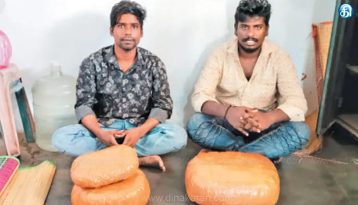 இந்நிலையில், திருத்தணி அருகே சென்னை-திருப்பதி தேசிய நெடுஞ்சாலையில் பொன்பாடி சோதனைச் சாவடியில் நேற்று மதுவிலக்கு அமல் பிரிவு போலீசார் வாகன சோதனையில் ஈடுபட்டனர். அப்போது, திருப்பதியில் இருந்து காஞ்சிபுரம் செல்லும் ஆந்திர மாநில அரசுப் பேருந்தில் போலீசார் சோதனை நடத்தினர். இதில், சென்னை ராயபுரம் பகுதியைச் சேர்ந்த ஜாஹிர் ஹூசேன் என்பவர் மகன் ஆஜிஸ் (27), திருவொற்றியூரைச் சேர்ந்த திருநாவுக்கரசு என்பவர் மகன் தினேஷ் (28) ஆகிய இருவரும், சீட்டின் அடியில் கஞ்சா பொட்டலங்களை ஒரு பையில் போட்டு மறைத்து வைத்திருந்தனர்.