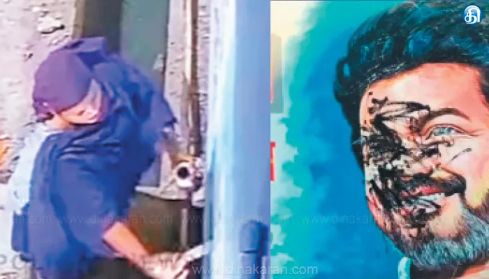 இந்நிலையில், நேற்று முன்தினம் இரவு சுடிதார் அணிந்து வந்த இளம் பெண் ஒருவர் கருப்பு நிறத்தில் 50 மில்லி பெயிண்ட் வாங்கி வந்து நடிகர் விஜய்யின் முகத்தில் பூசினார். இதனை அந்த வழியாக வந்த வாகன ஓட்டிகள் மற்றும் பொதுமக்கள் கண்டு திடுக்கிட்டனர். இதுகுறித்து, தகவலறிந்ததும் தமிழக வெற்றி கழகத்தினர் திரண்டு வந்தனர். அதற்குள் அந்த இளம் பெண் அங்கிருந்து கிளம்பி சென்றுவிட்டார். இதுகுறித்த வீடியோ சமூக வலைதளங்களில் வைரலாகி வருகிறது. மேலும் இச்சம்பவம் குறித்து தமிழக வெற்றி கழகத்தினர் கூடுவாஞ்சேரி போலீசில் புகார் செய்தனர். அதன்பேரில், கூடுவாஞ்சேரி போலீசார் வழக்குபதிவு செய்து நடிகர் விஜய் முகத்தில் பெயிண்ட் பூசிய இளம் பெண் குறித்து விசாரணை நடத்தி அவரை தீவிரமாக தேடி வருகின்றனர். இந்த சம்பவம் கூடுவாஞ்சேரியில் பெரும் பரபரப்பை ஏற்படுத்தியுள்ளது.