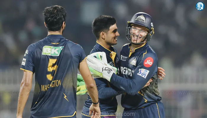 அதையடுத்து, பட்லருடன் தமிழக வீரர் ஷாருக்கான் இணை சேர்ந்து ஆடினார். கடைசி ஓவரில், இருவரும் சேர்ந்து 18 ரன் விளாசினர். முதல் இன்னிங்சில் குஜராத் அணி, 3 விக்கெட் இழப்புக்கு 198 ரன் குவித்தது. பட்லர் 41, ஷாருக்கான் 11 ரன்னுடன் களத்தில் இருந்தனர். கொல்கத்தா தரப்பில், அரோரா, ராணா, ரஸல் தலா ஒரு விக்கெட் எடுத்தனர்.அதையடுத்து, 199 ரன் எடுத்தால் வெற்றி என்ற கடின இலக்குடன் கொல்கத்தா அணி, 20 ஓவருக்கு 159 ரன் மட்டுமே எடுத்து 39 ரன் வித்தியாசத்தில் குஜராத் அணியிடம் தோல்வியைத் தழுவியது. கொல்கத்தா பேட்டிங்கில் அதிகபட்சமாக ரகானே 50 ரன்(1 சிக்சர், 5 பவுண்டரி), ரகுவன்ஷி 27 ரன் எடுத்தனர்.