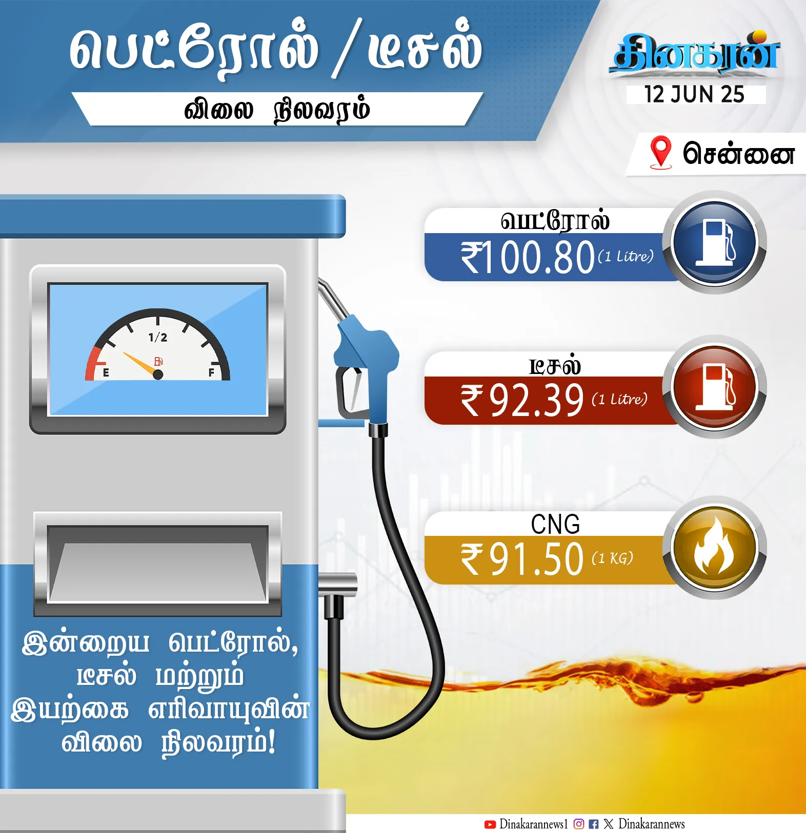 The post ஜூன் 12: பெட்ரோல் விலை 100.80, டீசல் விலை 92.39 -க்கு விற்பனை..! appeared first on Dinakaran.