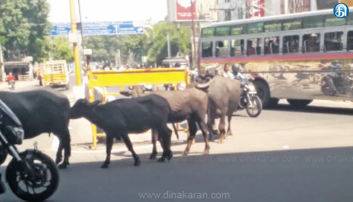 போக்குவரத்து நெருக்கடி மிகுந்த இந்த சாலையில் நேற்று காலை கால்நடைகள் குறுக்கு நெடுக்காக சென்றன. எங்கிருந்து வந்தது யார் ஓட்டிவந்தார்கள் என்பது கூட தெரியாத நிலையில் வாகன ஓட்டிகள் கால்நடைகள் எங்கு செல்வது என்று தெரியாதை வகையில் குறுக்கும் நெடுக்குமாகச் சென்றன. இதனால் நான்கு திசைகளிலும் இருந்து வரும் வாகனங்கள் தட்டுதடுமாறி சென்றன.