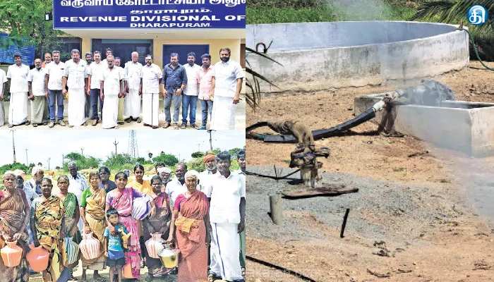 இந்நிலையில் ஊராட்சியை சேர்ந்த பொது மக்களின் பிரதிநிதிகள் 20க்கும் மேற்பட்டோர் நேற்று தாராபுரம் கோட்டாட்சியர் அலுவலகத்தில் குழந்தை தொழிலாளர் முறை ஒழிப்பு விழிப்புணர்வு உறுதிமொழி ஏற்ப நிகழ்ச்சிக்கு வந்திருந்த அமைச்சர் கயல்விழி செல்வராஜ், ஆர்டிஓ பெலிக்ஸ் ராஜா ஆகியோரை நேரில் சந்தித்து தங்கள் கிராமத்திற்கு கடந்த 15 நாட்களாக குடிநீர் விநியோகம் செய்வது தடைபட்டுள்ளது என்றும், தனிநபர் ஒருவர் விதிமுறைக்கு மீறி செய்த செயலால் தற்போது ஆயிரத்திற்கும் மேற்பட்டோர் குடிநீரின்றி 15 நாட்களாக தவித்து வருவதாகவும் புகார் கூறினர்.
