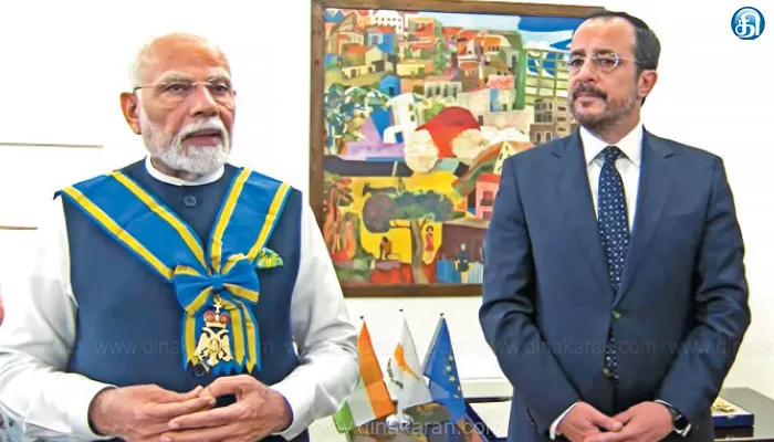 20 ஆண்டுகளுக்குப் பிறகு சைப்ரஸ் செல்லும் முதல் இந்திய பிரதமர் மோடி ஆவார். இதையொட்டி அவரை கவுரவிக்கும் விதமாக சைப்ரசின் உயரிய விருதான ‘கிராண்ட் கிராஸ் ஆப் தி ஆர்டர் ஆப் தி மகாரியோஸ் 3’ விருதை பிரதமர் மோடிக்கு சைப்ரஸ் அதிபர் நிகோஸ் வழங்கி கவுரவித்தார். இந்த விருதை பெற்ற பிரதமர் மோடி, ‘‘இந்த விருதை 140 கோடி இந்தியர்களுக்கு இந்த விருதை அர்ப்பணிக்கிறேன். இது நம்பகமான இந்தியா-சைப்ரஸ் நட்புக்கு ஒரு உதாரணம். எதிர்காலத்தில் எங்கள் ஒத்துழைப்பு புதிய உச்சங்களை தொடும் என நம்புகிறேன்.