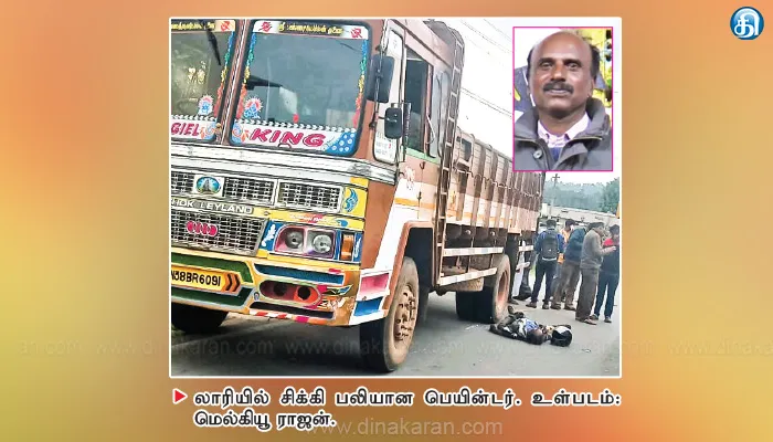 அதேப்போல் நேற்று காலையும் மெல்கியூ ராஜன், தனது வீட்டில் இருந்து இருசக்கர வாகனத்தில் பாய்ஸ் கம்பெனி பகுதியை நோக்கி சென்றபோது பாய்ஸ் கம்பெனி அருகே ஊட்டியை நோக்கி சென்று கொண்டிருந்த லாரி, இருசக்கர வாகனத்தை முந்தி சென்றபோது லாரியின் இடதுபுறத்தில் உள்ள இரும்பு கொக்கியில் மெல்கியூராஜன் மாட்டி, சாலையில் தரதரவென இழுத்து செல்லப்பட்டார்.