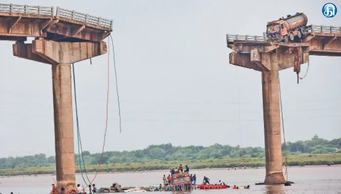 குஜராத் மாநிலம் மோர்பி நகரில் கடந்த 2022ம் ஆண்டு அக்டோபர் 30ம் தேதி மச்சு ஆற்றின் குறுக்கே இருந்த பழமையான தொங்கு பாலம் அறுந்து விழுந்ததில் 141க்கும் மேற்பட்டோர் பரிதாபமாக உயிரிழந்தனர். அந்தப் பாலத்தை உரிய முறையில் பராமரிக்காமலும், அதன் உறுதித்தன்மையை சோதிக்காமலும், அதிகப்படியான மக்களை அனுமதித்ததே அந்த பேரிழப்புக்குக் காரணம் என்று கண்டறியப்பட்டது. அந்த சோக சம்பவத்தின் வடுக்கள் மக்கள் மனதிலிருந்து இன்னமும் அகலாத நிலையில்,நேற்று மற்றொரு பாலம் இடிந்து விழுந்திருப்பது உள்கட்டமைப்பு பராமரிப்பில் அதிகாரிகள் அலட்சியமாக இருப்பதை காட்டுவதாக குஜராத் மக்கள் குற்றம் சாட்டி உள்ளனர்.