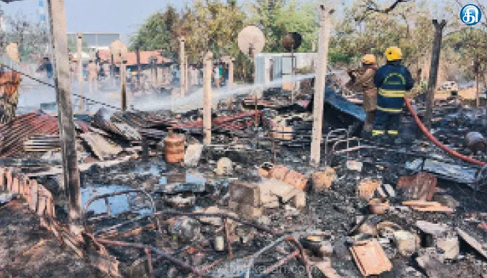 தொடர்ந்து அருகில் உள்ள வீடுகளில் வைக்கப்பட்டிருந்த 5க்கும் மேற்பட்ட சிலிண்டர்களும் அடுத்தடுத்து வெடித்து சிதறி தீ விபத்து ஏற்பட்டது. இந்த விபத்தில் தீ மளமளவென பரவியது. தொடர்ந்து அங்கிருந்த தகர கொட்டகைகளால் ஆன 42 வீடுகளும் தீக்கிரையாகி தரைமட்டமானது. வீட்டில் இருந்த உடைமைகள் தீயில் எரிந்து சாம்பலானது.