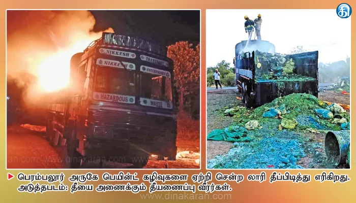 The post பெரம்பலூர் அருகே அதிகாலை பெயிண்ட் கழிவுகள் ஏற்றிச்சென்ற லாரி தீப்பிடித்து எரிந்து சேதம் appeared first on Dinakaran.