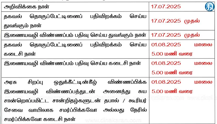 அரசு சிறப்பு ஒதுக்கீட்டின்கீழ் விண்ணப்பிக்க விருப்பமுள்ளவர்கள் மட்டும், இணையவழியில் விண்ணப்பித்த பிறகு அந்த விண்ணப்பத்தை பதிவிறக்கம் செய்து, கோரப்பட்டுள்ள அனைத்துச் சான்றிதழ்களின் சுய சான்றொப்பமிட்ட நகல்களையும் இணைத்து செயலாளர், தேர்வுக்குழு, இந்திய மருத்துவம் மற்றும் ஓமியோபதித் துறை ஆணையர் அலுவலகம், அறிஞர் அண்ணா அரசினர் இந்திய மருத்துவமனை வளாகம், அரும்பாக்கம், சென்னை-600 106 என்ற முகவரிக்கு 01.08.2025 மாலை 5.00 மணிக்குள் சமர்ப்பித்தல் / வந்து சேர வேண்டும்.
