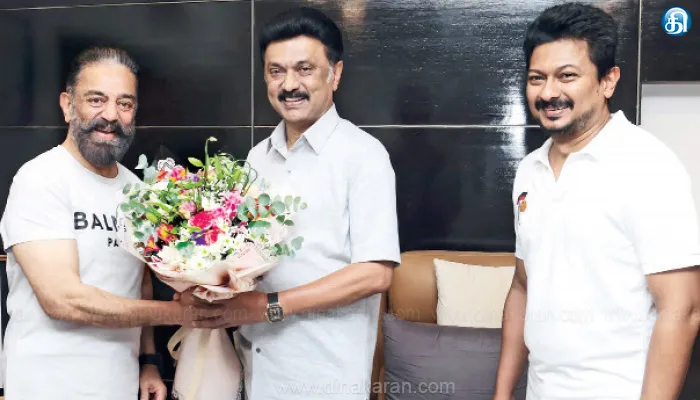 இந்நிலையில், முதல்வர் மு.க.ஸ்டாலினை மக்கள் நீதி மய்யம் கட்சி தலைவர் கமல்ஹாசன் எம்பி நேற்று சந்தித்தார். ஆழ்வார்பேட்டையில் உள்ள இல்லத்தில் இந்த சந்திப்பு நடந்தது. அப்போது துணை முதல்வர் உதயநிதி ஸ்டாலின் உடனிருந்தார். சந்திப்பின்போது, முதல்வர் மு.க.ஸ்டாலின் உடல்நலம் குறித்து கமல்ஹாசன் விசாரித்தார். மேலும் அரசியல் நிலவரம் குறித்தும் இரு தலைவர்களும் பேசியதாக கூறப்படுகிறது. அதுமட்டுமல்லாமல் மாநிலங்களவை எம்பியாக பதவியேற்றதற்காக முதல்வர் மு.க.ஸ்டாலினிடம் கமல்ஹாசன் பூங்கொத்து கொடுத்து வாழ்த்து பெற்றார்.
