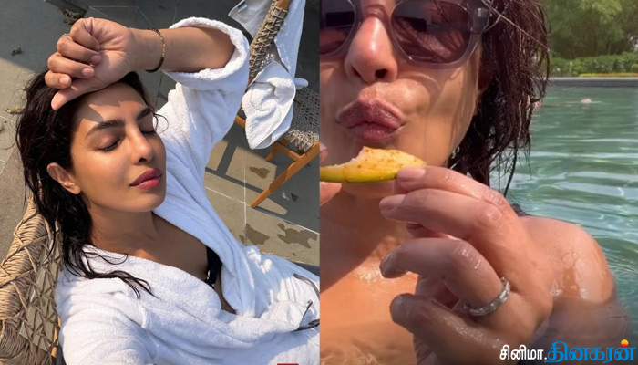 கடந்த ஞாயிறு அன்று படப்பிடிப்பு இல்லாததால், அன்றைய தினம் ஓட்டல் நீச்சல் குளத்தில் தனது தோழியுடன் ஆனந்தமாக நீராடி மகிழ்ந்த சில போட்டோக்களை பிரியங்கா சோப்ரா பதிவிட்டுள்ளார். நீச்சலுக்கு இடையே, மிளகாய் பொடி தூவிய மாங்காய் துண்டுகளை அவர் சாப்பிட்டார். இதுகுறித்து அவர் கூறுகையில், ‘இந்த ஞாயிறு, உண்மையிலேயே ஒரு சூப்பரான ஞாயிறாக உணர்ந்த தருணம் இது’ என்றார்.