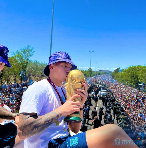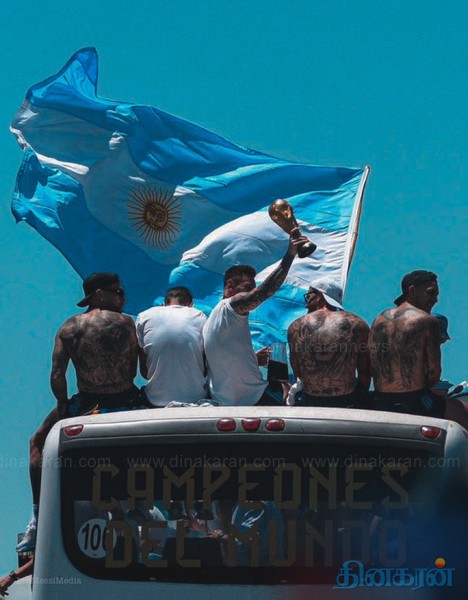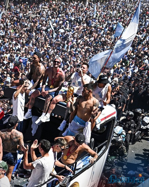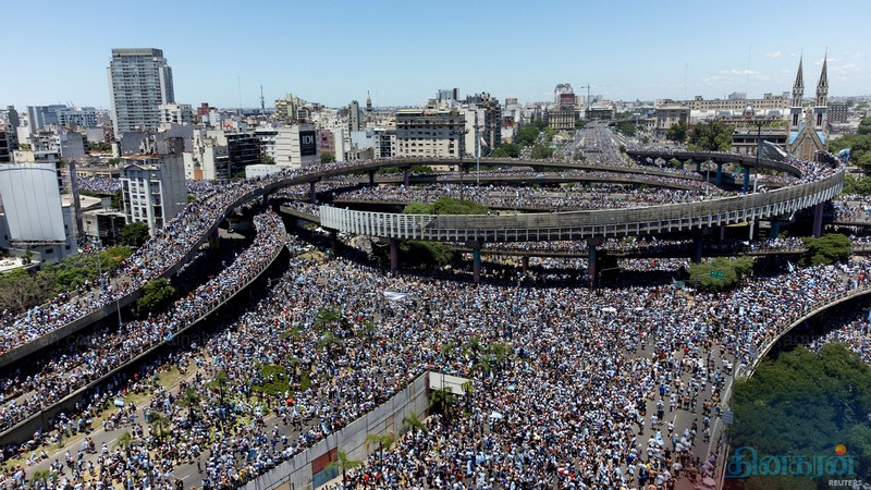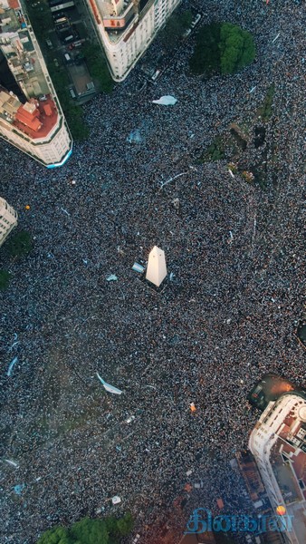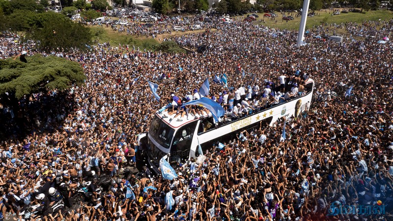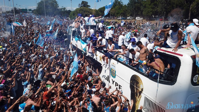 கத்தாரில் நடைபெற்ற உலகக்கோப்பை இறுதி போட்டியில் பிரான்ஸை வீழ்த்திய அர்ஜெண்டினா வீரர்கள் தனி விமானம் மூலமாக பியூனஸ் அயர்ஸில் வந்து இறங்கினர். பின்னர், திறந்தவெளி பேருந்தில் தேசியக்கொடியை ஏந்தி பேரணியாக சென்ற வீரர்களுக்கு சாலையின் வழிநெடுகிலும் லட்ச கணக்கானோர் பாடல்களை பாடி உற்சாக முழக்கத்துடன் வரவேற்பு அளித்தனர். கால்பந்து நாயகன்களை வரவேற்பதற்காக தேசிய விடுமுறை அறிவிக்கப்பட்டதால் ஆடல், பாடல்களுடன் களைகட்டிய கொண்டாட்டங்கள் அர்ஜெண்டினா தலைநகரை அதிர செய்தது. இதனால், பியூனஸ் அயர்ஸில் எங்கு பார்த்தாலும் மனித தலைகளாகவே காட்சியளித்தன.