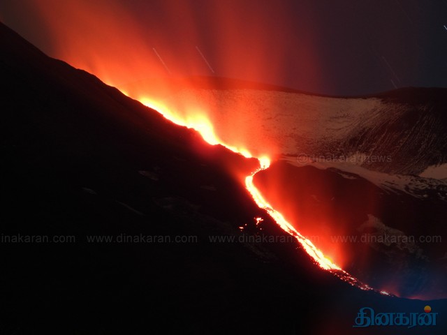 இத்தாலியில் உள்ள எட்னா எரிமலை வெடித்து நெருப்பு குழம்பை வெளியிட்டு வருகின்றது. ஐரோப்பிய கண்டத்தில் உள்ள 3 பெரிய எரிமலைகளில் ஒன்றான எட்னா, இத்தாலி நாட்டில் உள்ள சிசிலி பகுதியில் அமைந்துள்ளது. கடந்த மாத இறுதியில் கரும்புகையை வெளியிட்டு வந்த எட்னாவில் தற்போது சீற்றம் உச்சத்தை அடைந்துள்ளது. எரிமலையின் முகப்பு பகுதியில் இருந்து லாவா எனப்படும் நெருப்பு குழம்பும், சாம்பலும் வெளியாகி வருகிறது. தற்போது இரவு நேரங்களில் எரிமலையில் இருந்து லாவா நெருப்பு குழம்பாக பாய்வதை தூரத்தில் இருந்தபடி சுற்றுலாப் பயணிகள் பார்வையிட்டு வருகின்றனர்.