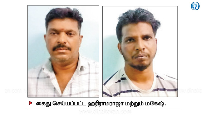 இந்த நிலையில் ஆரல்வாய்மொழி அருகே வாகன சோதனையின்போது ஹரிராம ராஜா மற்றும் மகேஷ் ஆகியோரை தனிப்படை போலீசார் சுற்றி வளைத்து பிடித்தனர். அவர்களை ஆரல்வாய்மொழி காவல் நிலையத்துக்கு கொண்டு வந்து விசாரணை நடத்தினர். பின்னர் இருவரையும் கைது செய்தனர். கைதான இருவரும் நீதிமன்றத்தில் ஆஜர்படுத்தப்பட்டு சிறையில் அடைக்கப்பட்டனர்.
