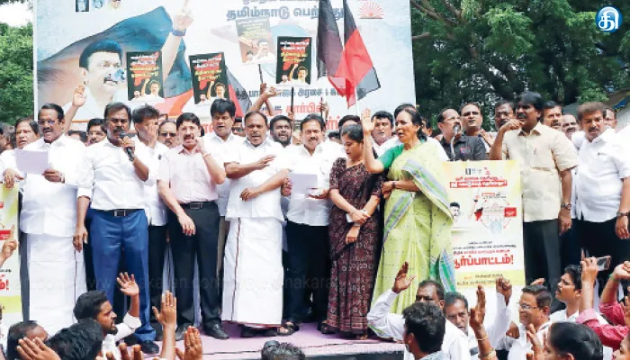 இதேபோல காஞ்சிபுரம் மாவட்டச் செயலாளர் சுந்தரம் எம்எல்ஏ தலைமையில் காஞ்சிபுரத்தில் ஆர்ப்பாட்டம் நடந்தது. அதில் எம்பி செல்வம், எம்எல்ஏ எழிலரசன் உள்பட ஏராளமானவர்கள் பங்கேற்றனர். திருவள்ளூரில் நடந்த ஆர்ப்பாட்டத்தில் மாவட்டச் செயலாளர்கள் ஆவடி நாசர், திருத்தணி சந்திரன் மற்றும் எம்எல்ஏ வி.ஜி.ராஜேந்திரன் உள்ளிட்டவர்கள் பங்கேற்றனர். அதேபோல, தமிழகம் முழுவதும் மாவட்ட தலைநகரங்களில் மாபெரும் கண்டன ஆர்ப்பாட்டம் நடந்தது. இதில் எம்பி, எம்எல்ஏக்கள், மாவட்ட செயலாளர்கள், ஒன்றிய, நகர, பகுதி, பேரூர், வட்ட, கிளைக் கழகச் செயலாளர்கள்-நிர்வாகிகள், அனைத்து அமைப்புகளில் உள்ள அணிகளின் நிர்வாகிகள், உள்ளாட்சி அமைப்புகளின் பிரதிநிதிகள் உள்ளிட்ட ஏராளமானோர் கலந்து கொண்டனர்.