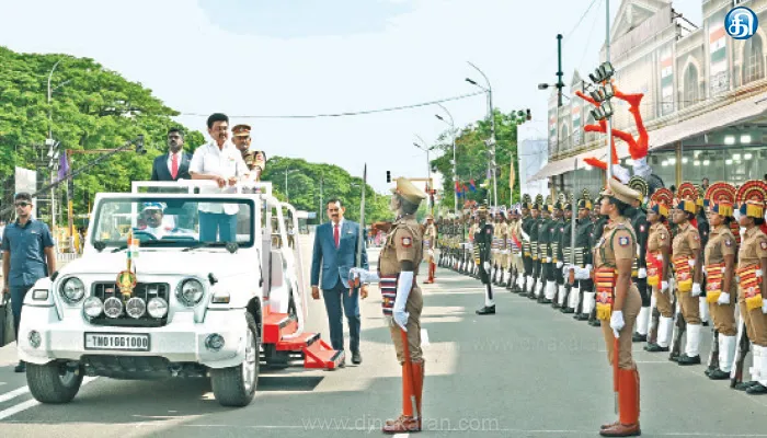 இதையடுத்து தமிழ்நாடு காவல்துறை மற்றும் கேரள காவல்துறையினர் நடத்திய அணி வகுப்பு மரியாதையை திறந்தவெளி ஜீப்பில் முதல்வர் பார்வையிட்டார். இதன் பின்னர் கோட்டை கொத்தளத்தில் சரியாக காலை 9 மணிக்கு தேசிய கொடியை முதல்வர் மு.க.ஸ்டாலின் ஏற்றினார். இதைத்தொடர்ந்து, தகைசால் தமிழர் விருது காங்கிரஸ் கட்சியின் முதுப்பெரும் தலைவர் குமரி அனந்தனுக்கும், டாக்டர் ஏ.பி.ஜே.அப்துல் கலாம் விருது இஸ்ரோவின் சந்திரயான் – 3 திட்ட இயக்குநர் வீரமுத்துவேலுவுக்கும், துணிவு மற்றும் சாகச செயலுக்கான கல்பனா சாவ்லா விருது வயநாட்டில் ஏற்பட்ட நிலச்சரிவின்போது துணிச்சலாக பணியாற்றிய செவிலியர் சபீனாவிற்கும் முதல்வர் மு.க.ஸ்டாலின் வழங்கி கவுரவித்தார்.