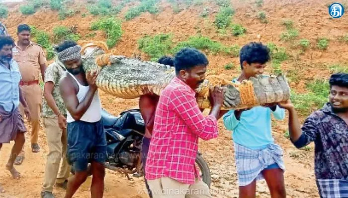 இந்நிலையில் காட்டுக்கூடலூர் கிராமத்தில் அவ்வப்போது கிராம மக்களை மிரட்டி வந்த சுமார் 400 கிலோ எடையும், 12 அடி நீளமும் கொண்ட முதலை நேற்று முன்தினம் கரையில் படுத்திருந்தது. அப்போது அந்த பக்கமாக சென்ற சிறுமி, இதை பார்த்து கூச்சலிட்டாள். உடனடியாக அங்கு திரண்ட கிராம மக்கள், கரையில் படுத்திருந்த முதலையை எந்த ஒரு பாதுகாப்பு உபகரணமும் இல்லாமல் மடக்கி பிடித்தனர். பின்னர் முதலையின் கால்கள் மற்றும் வாயை கட்டி தோளில் தூக்கி சென்று, மினிவேனில் ஏற்றி சென்று வனத்துறை அதிகாரிகளிடம் ஒப்படைத்தனர்.