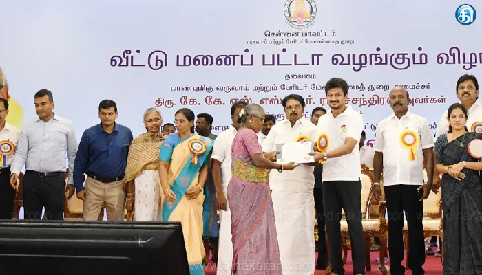 தமிழ்நாட்டிலேயே முதன் முதலாக கட்டட அனுமதி ஆன்லைன் மூலமாக உடனடியாக பெற வேண்டும் என்ற திட்டத்தையும் நேற்று முன்தினம் நம்முடைய முதலமைச்சர் துவக்கி வைத்திருக்கிறார்கள். வீடு எவ்வளவு முக்கியமோ, அதே அளவு, அந்த வீட்டுக்கான பட்டாவும் மிக மிக முக்கியம். அந்த வகையில் பார்த்தால் உங்கள் ஒவ்வொருவருக்கும் இந்த நாள் மிக மிக மகிழ்ச்சியான முக்கியமான ஒரு நாள். ஏனென்றால், பட்டா வேண்டும் என்பவருடைய பல வருட கனவு இன்று நனவாகி இருக்கிறது. குறிப்பாக, சென்னையில் நான் தேர்தல் பிரச்சாரத்தில் ஈடுபட்டபோது, முதலமைச்சரின் அறிவுரைப்படி, உங்களுக்கெல்லாம் ஒரு வாக்குறுதியை வழங்கியிருந்தேன். சென்னையில் பட்டா பிரச்சினை பல வருடங்களாக இருக்கிறது. அப்படி பட்டா கிடைக்காமல் இருப்பவர்களுக்கு நிச்சயம் பட்டா வழங்கப்படும் என்ற அந்த வாக்குறுதியை தேர்தல் பிரச்சாரத்தின்போது நான் அளித்திருந்தேன். தேர்தல் முடிவுகள் முடிந்து 2 மாதம் தான் ஆகியிருக்கிறது. இந்த 2 மாதத்திற்குள் முதலமைச்சர் அவர்கள், உங்களுக்கு அளித்த வாக்குறுதியை நிறைவேற்றி இருக்கிறார்கள். நம்முடைய திராவிட மாடல் அரசு, பல வருடங்களாக பட்டா இல்லாமல் இருந்தவர்களுக்கு கூட இன்றைக்கு பட்டா வழங்கியுள்ளது.