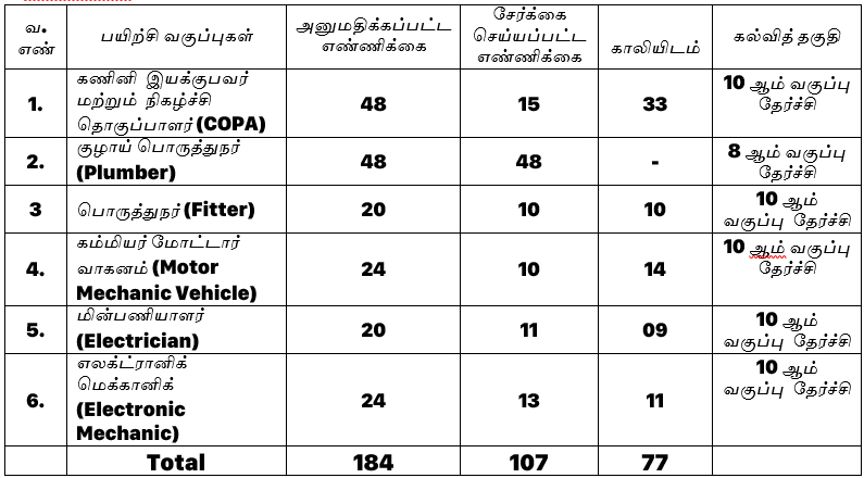 2025-26ஆம் கல்வி ஆண்டிற்கு தொழிற் பயிற்சியில் சேர நேரடி சேர்க்கை வழங்கப்படுகின்றது. பெருநகர சென்னை மாநகராட்சியின் www.chennaicorporation.gov.in என்ற இணையதள முகவரியில் விண்ணப்பப் படிவத்தினை இலவசமாக பதிவிறக்கம் செய்து, பூர்த்தி செய்த விண்ணப்பத்தினை கீழ்காணும் முகவரியில் நேரடியாக சமர்ப்பித்து சேர்க்கையினை பெறலாம். சேர்க்கைக்கான கடைசி நாள் 31.08.2025 ஆகும்.