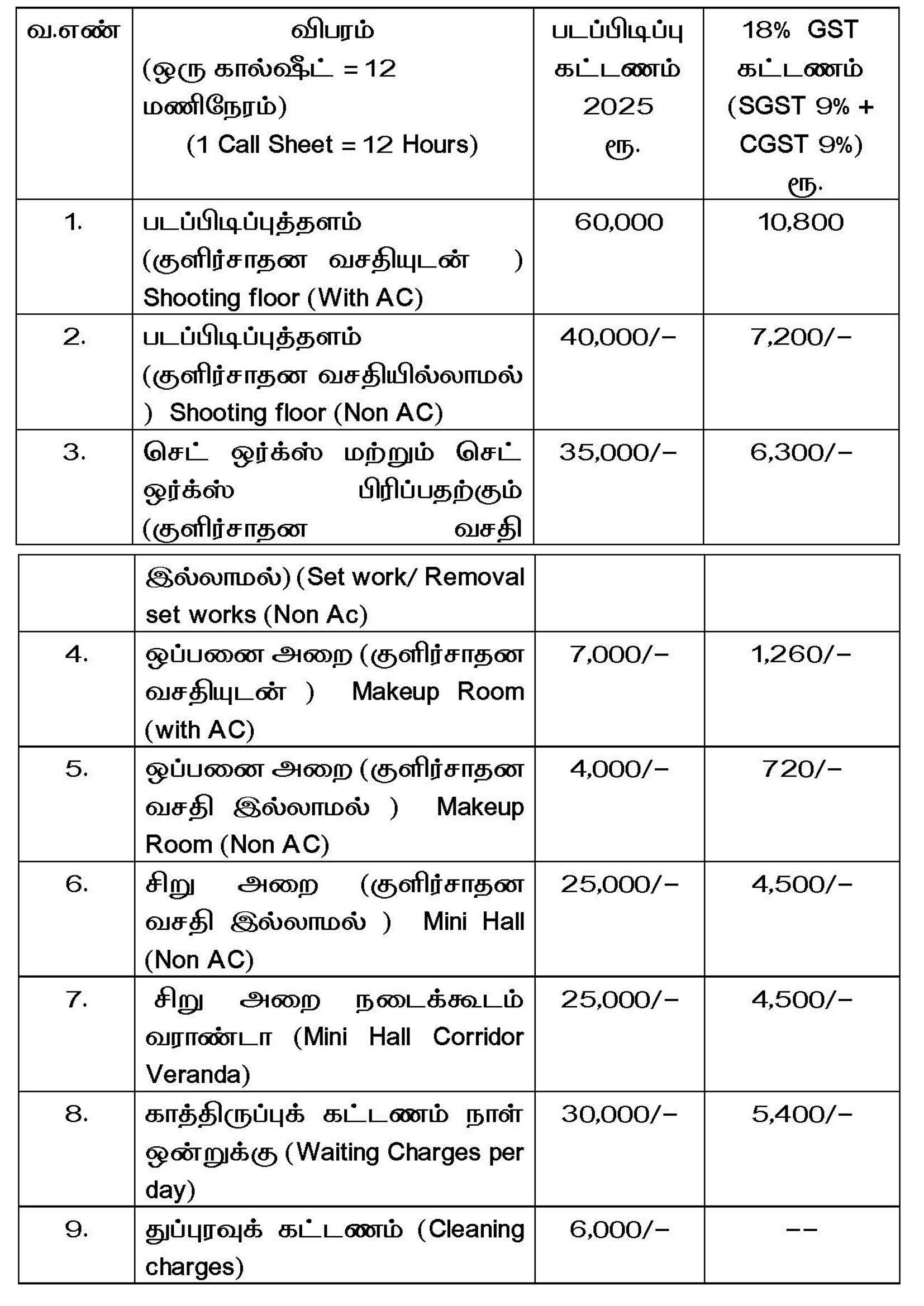 அட்டவணையின்படி, ஒவ்வொரு கால்ஷீட்டுக்கும் 12 மணிநேரம் எனப் படப்பிடிப்புக்கான கட்டணம் நிர்ணயிக்கப்பட்டுள்ளது. எனவே, தமிழ்நாடு அரசு எம்.ஜி.ஆர் திரைப்படம் மற்றும் தொலைக்காட்சி பயிற்சி நிறுவன வளாகத்தில் அமைந்துள்ள குளிர்சாதன வசதியுடன் கூடிய படப்பிடிப்புத் தளத்தில் படப்பிடிப்பு நடத்த விரும்பும் திரைப்படத் துறையினர், சின்னத்திரை மற்றும் தனியார் நிறுவனங்கள் ஆகியோர் இயக்குநர்,செய்தி மக்கள் தொடர்புத்துறை அவர்களிடம் முன்அனுமதி பெற்று, அரசால் நிர்ணயிக்கப்பட்ட கட்டணங்களை செலுத்தி, உரிய அனுமதியுடன் இவ்வசதிகளை பயன்படுத்தலாம் என தெரிவித்துக்கொள்ளப்படுள்ளது.