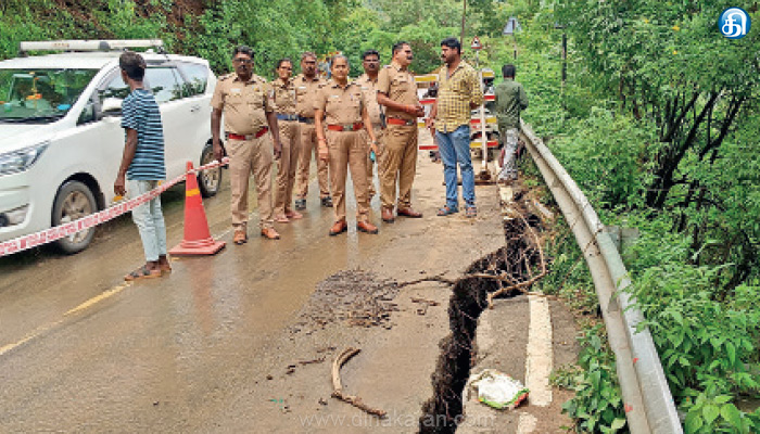 தேனி மாவட்டம் லோயர்கேம்பில் இருந்து குமுளி செல்லும் மலைச்சாலையில், நேற்று மழை காரணமாக 3வது பாலம் அருகே விரிசல் விட்டிருப்பதை கண்ட வாகன ஓட்டிகள் அச்சமடைந்து வாகனங்களை இயக்காமல் நிறுத்தி வைத்தனர். இதனால் சுமார் ஒரு மணிநேரத்துக்கு மேலாக போக்குவரத்து பாதிக்கப்பட்டது. நெடுஞ்சாலைத் துறையினர் மற்றும் போலீசார், மலைச்சாலையில் விரிசல் விட்ட பகுதிக்கு வாகனங்கள் செல்லாதவாறு பேரிகார்டு அமைத்து ஒரு பக்கமாக வாகனங்கள் செல்லும் வகையில் தற்காலிக போக்குவரத்துக்கு நடவடிக்கை மேற்கொண்டனர்.