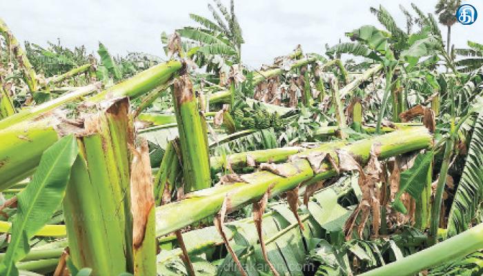 குலை தள்ளி நன்கு விளைந்து அறுவடைக்கு தயாராக இருந்த நிலையில் வாழைகள் சேதமடைந்துள்ளதால் விவசாயிகள் கவலையடைந்து உள்ளனர். சூறாவளி காற்றில் ரூ.5 லட்சம் மதிப்புள்ள 3 ஆயிரத்துக்கும் மேற்பட்ட வாழைகள் சேதமடைந்துள்ளதாக தெரிவித்தனர். வருவாய்த்துறை அதிகாரிகள் சேதமடைந்த வாழைகள் குறித்து ஆய்வு செய்தனர். ஏக்கருக்கு ரூ.1 லட்சம் வரை செலவு செய்து அறுவடைக்கு தயாராக இருந்த நிலையில் வாழைகள் சேதம் அடைந்துள்ளது கவலை அடையச் செய்துள்ளதாகவும், அரசு உரிய நிவாரணம் வழங்க வேண்டும் எனவும் விவசாயிகள் வலியுறுத்தி உள்ளனர்.