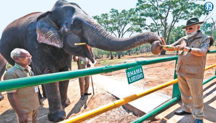 அங்கு அன்று இரவு தங்கிய அவர், நேற்று காலை பந்திப்பூர் புலிகள் காப்பகத்திற்கு உட்பட்ட வனப்பகுதியில் வாகனம் மூலம் சவாரி மேற்கொண்டு, இயற்கை அழகை ரசித்து வன விலங்குகளை பைனாகுலர் மூலம் கண்டு ரசித்து புகைப்படம் எடுத்து மகிழ்ந்தார். சுமார் 22 கிமீ தூரம் பந்திப்பூர் புலிகள் காப்பகத்தில் சவாரி மேற்கொண்ட அவர், பின்னர் கார் மூலம் முதுமலை தெப்பக்காடு யானைகள் முகாமிற்கு நேற்று காலை 11 மணியளவில் வந்தார். அங்கு பிரதமர் மோடியை தமிழ்நாடு வனத்துறை முதன்மை செயலர் சுப்பிரயா சாஹு, நீலகிரி கலெக்டர் அம்ரித் மற்றும் எஸ்பி பிரபாகரன் ஆகியோர் மலர் கொத்து கொடுத்து வரவேற்றனர். தொடர்ந்து முகாமில் உள்ள 28 வளர்ப்பு யானைகளை பார்வையிட்டு, கரும்பு போன்ற உணவுகளை வழங்கி மகிழ்ந்தார்.