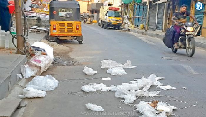 மேலும், கடைகளில் உள்ள குப்பையை அங்கு வரும் தூய்மை பணியாளர்களிடம் வழங்காமல், இரவு 11 மணிக்கு மேல் கடைகளை மூடும்போது, கடையில் உள்ள குப்பை மற்றும் பிளாஸ்டிக் கழிவுகளை சாலையில் வீசிச் செல்கின்றனர். குறிப்பாக ஜவுளிக்கடை, பேன்சி ஸ்டோர்ஸ் மற்றும் பல சரக்கு கடை போன்றவற்றில் இருந்து பிளாஸ்டிக் கழிவுகளை மூட்டையாக கட்டி, சாலையில் வீசிவிட்டு சென்று விடுகின்றனர். அவ்வழியே செல்லும் வாகனங்கள் அவற்றின் மீது ஏறி செல்வதால் மூட்டைகள் அவிழ்ந்து சாலையில் பிளாஸ்டிக் கழிவுகள் சிதறி காற்றில் சாலை முழுவதும் பரவிவிடுகிறது. இதனால், இரவு நேர பணி முடிந்து வீட்டிற்கு செல்லவேண்டிய தூய்மை பணியாளர்கள், இந்த பிளாஸ்டிக் குவியலால், அதிகாரிகளுக்கு பயந்து மீண்டும் அந்த கழிவுகளை அகற்றிவிட்டுல வீட்டிற்கு செல்லும் நிலை ஏற்படுகிறது.