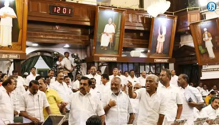 சென்னை : தமிழக சட்டப்பேரவையில் இருந்து எடப்பாடி பழனிசாமி உள்ளிட்ட அதிமுக உறுப்பினர்கள் வெளிநடப்பு செய்தனர். அதிமுகவில் ஒற்றை தலைமை மோதல் காரணமாக எடப்பாடி பழனிசாமி- ஓ.பன்னீர் செல்வம் இடையே மோதல் போக்கு ஏற்பட்டது. இதனையடுத்து நடைபெற்ற தேர்தலில் அதிமுக பொதுச்செயலாளராக எடப்பாடி பழனிசாமி தேர்ந்தெடுக்கப்பட்டார். எதிர்க்கட்சித் துணைத் தலைவராக ஆர்.பி உதயகுமார் தேர்வு செய்யப்பட்டதாக எடப்பாடி அறிவித்தார்.