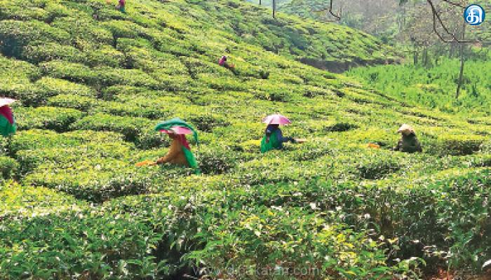 கோடை வெயில் தாக்கத்தில் இருந்து தங்களை பாதுகாத்து கொள்வதற்காக தேயிலைத்தோட்டங்களில் பசுந்தேயிலை பறிக்கும் பெண் தொழிலாளர்கள் தலையில் குடையை கட்டிக்கொண்டு பணிபுரிந்து வருகின்றனர். தொழிலாளர்கள் கூறுகையில், மலை பகுதியில் வெயிலின் தாக்கம் அதிகரித்துள்ளதால் தேயிலை மகசூல் குறைந்துள்ளது. நாள் ஒன்றுக்கு தேயிலை தோட்டம் நிர்வாகம் நிர்ணயிக்கும் கிலோ பசுந்தேயிலையை பறிக்கவேண்டிய நிலை ஏற்பட்டுள்ளது. வெப்பத்தின் தாக்கத்தில் இருந்து பாதுகாத்து கொள்வதற்காக தலையில் குடைகளை கட்டிக்கொண்டு பசுந்தேயிலை பறிக்கும் பணியில் ஈடுபட்டு வருவதாக தெரிவித்தனர்.