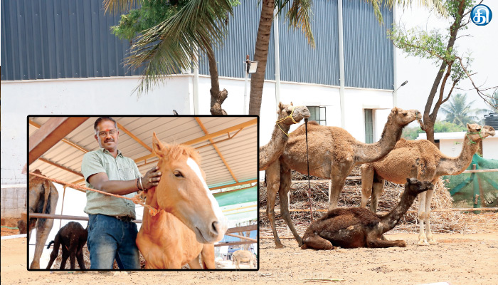 அரசு அனுமதி பெற்று குஜராத் பகுதியில் இருந்து 6 ஒட்டகம் கொண்டு வந்து, நீலாம்பூரை அடுத்த எல் அண்டு டி பைபாஸ் ரோட்டில் சங்கமித்ரா என்ற பெயரில் ஒட்டகப் பண்ணை அமைத்து பால் விற்பனை செய்து வருகிறார். இது தவிர ஒட்டகத்தை காணவரும் மக்களை கவர்வதற்காக அங்கேயே குதிரை, முயல், வாத்து, மீன்களை வளர்த்துவருகிறார்.இதுகுறித்து மணிகண்டன் கூறுகையில், நான் எம்.இ படித்து உள்ளேன். நானும், எனது மனைவி சுப்புலட்சுயும் கொரோனா இரண்டாவது அலையின் போது பாதிக்கப்பட்டோம். அப்போது ஒட்டகப் பாலில் நோய் எதிர்ப்புச்சக்தி அதிகமாக உள்ளதாக படித்தேன். வெளிமாநிலத்தில் இருந்து ஒட்டகப் பால் வாங்கி குடித்து வந்தேன். எங்கள் உடல் நிலையில் முன்னேற்றம் இருந்தது. இதனால் குஜராத்தில் இருந்து அரசு அனுமதி பெற்று 6 ஒட்டகம் வாங்கி வந்தேன். ஆரம்பத்தில் எங்களின் தேவைக்காக மட்டுமே பயன்படுத்த நினைத்தேன். பின்னர், அனைவருக்கும் பயன்பட வேண்டும் என எண்ணி இந்த ஒட்டகப் பண்ணையை ஆரம்பித்தேன். இதற்கு சங்கமித்தரா என பெயர் வைத்தோம். சங்கமித்தரா என்றால் சமுதாயத்தின் தோழி என பொருள். எல்லா சூழலிலும் வாழக்கூடிய வகையில் ஒட்டகங்கள் இருப்பதால் இங்கு சிரமமின்றி பராமரித்து வருகிறேன். இப்போது என்னிடம் 14 ஒட்டகம் உள்ளது. ஒட்டகப் பால் விரைவாக செரிமானம் ஆகும். சர்க்கரை நோயாளிகள் ஒட்டகப் பால் குடித்துவந்தால் சர்க்கரை அளவு கட்டுக்குள் இருக்கும். கேன்சர் நோயாளிகள் மற்றும் மூளை வளர்ச்சி குன்றிய குழந்தைகளுக்கு அளித்துவந்தால் செரிமானம் பிரச்சினை இருக்காது.