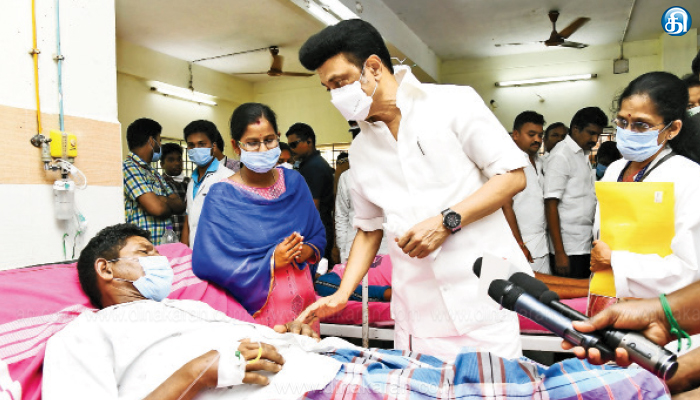 பின்னர், முதல்வர் மு.க.ஸ்டாலின் நிருபர்களிடம் கூறியதாவது: ‘விழுப்புரம் மாவட்டம் மரக்காணம் அருகே இருக்கக்கூடிய எக்கியர் குப்பம் மீனவர் கிராமத்தைச் சேர்ந்த பலர் கள்ளச்சாராயம் அருந்தியதால் உடல்நிலை பாதிக்கப்பட்டனர். இது அரசினுடைய கவனத்திற்கு வந்தவுடன் விழுப்புரம் மாவட்டம், முண்டியம்பாக்கம் அரசு மருத்துவக் கல்லூரி மருத்துவமனை, பாண்டிச்சேரி ஜிப்மர் மருத்துவமனை போன்ற பல்வேறு மருத்துவமனைகளுக்கு அவர்கள் அனுப்பி வைக்கப்பட்டு, உடனடியாக மருத்துவ சிகிச்சைக்கான ஏற்பாடுகள் செய்யப்பட்டன. மருத்துவ சிகிச்சை பலனளிக்காமல் இதுவரை 13 பேர் இறந்திருக்கிறார்கள். மேலும் 37 பேர் முண்டியம்பாக்கம் மருத்துவமனையிலும் 3 பேர் ஜிப்மர் மருத்துவமனையிலும், ஒருவர் புதுச்சேரி அரசு மருத்துவமனையிலும் தற்போது சிகிச்சை பெற்றுக் கொண்டிருக்கிறார்கள். இவர்களுக்குத் தேவையான அனைத்து சிகிச்சைகளையும் வழங்கி, உயிர்களை காப்பாற்றிடுமாறு மருத்துவர்களை நான் கேட்டுக் கொண்டிருக்கிறேன்.