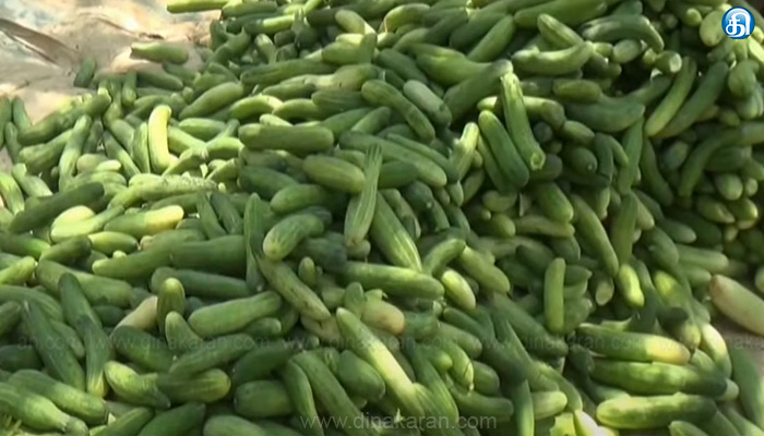 கடந்த ஆண்டு பெய்த மழையால் வெள்ளரிக்காய் விளைச்சல் அதிகரித்துள்ளதால் இருமடங்காக விலை சரிந்துள்ளதாக விவசாயிகள் வேதனை தெரிவித்துள்ளனர். கடந்த 3 மாதங்களுக்கு முன்பு ரூ.30கு விற்பனை செய்யப்பட்ட வெள்ளரிக்காய் தற்போது ரூ.4 க்கு கொள்முதல் செய்யப்படுகிறது. இதனால் அறுவடை கூலி கூட வருவாய் இல்லாத நிலை ஏற்பட்டுள்ளது. கோடை காலத்தில் அதிகமாக விற்பனை ஆக வேண்டிய வெள்ளரிக்காய் சுட்டெரிக்கும் வெயிலிலும் விலை வீழ்ச்சி காரணமாக விற்பனை மந்தமாக உள்ளதாக விவசாயிகள் வேதனை அடைந்துள்ளனர்.