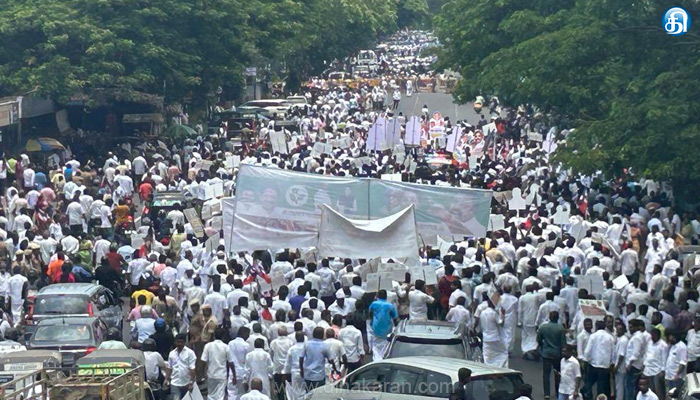 அதன்படி, அதிமுக பொதுச்செயலாளர் எடப்பாடி பழனிசாமி தலைமையில் அதிமுக முன்னாள் அமைச்சர்கள், எம்பி, எம்.எல்.ஏக்கள் மற்றும் நிர்வாகிகள் பேரணியாக சென்று இன்று (22ம் தேதி) தமிழ்நாடு ஆளுநர் ஆர்.என்.ரவியிடம் மனு அளிக்க ஏற்பாடு செய்யப்பட்டு இருந்தது. அதன்படி, இன்று காலை 11.30 மணிக்கு சென்னை, சைதாப்பேட்டை சின்னமலையில் இருந்து அதிமுக பொதுச்செயலாளர் எடப்பாடி பழனிசாமி தலைமையில் பேரணியாக கிண்டி ஆளுநர் மாளிகை நோக்கி புறப்பட்டனர். இந்த பேரணியில் அதிமுக முன்னாள் அமைச்சர்கள் கே.பி.முனுசாமி, நத்தம் விஸ்வநாதன், திண்டுக்கல் சீனிவாசன், தங்கமணி, எஸ்.பி.வேலுமணி, ஜெயக்குமார், சி.வி.சண்முகம் மற்றும் தமிழகம் முழுவதும் இருந்து வந்த அதிமுக நிர்வாகிகள் கலந்து கொண்டனர். ஆளுநர் மாளிகை அருகிலேயே அதிமுகவினர் பேரணியை போலீசார் தடுத்து நிறுத்தினர். இதையடுத்து எடப்பாடி பழனிசாமி உள்ளிட்ட மூத்த நிர்வாகிகள் சிலர் மட்டும் ஆளுநர் மாளிகைக்கு சென்று, மனு அளித்தனர்.