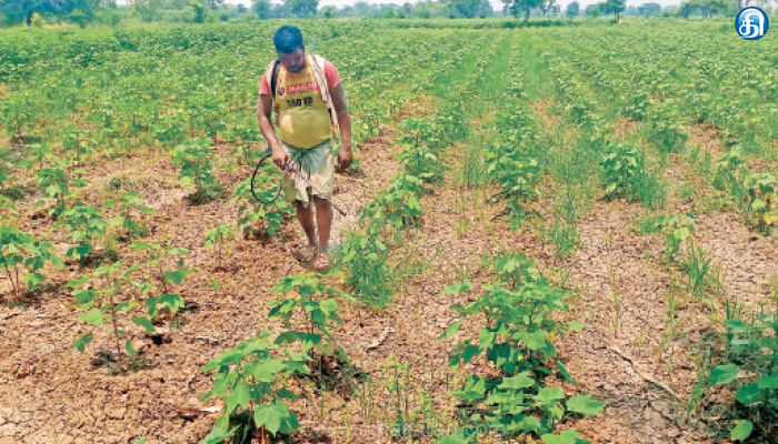 மழையால் பாதிக்கப்பட்ட பருத்தி பயிர்களை காக்க மருந்து தெளிப்பு பணி-செடிகள் வளர்ச்சி மீட்டெடுக்க விவசாயிகள் மும்முரம்