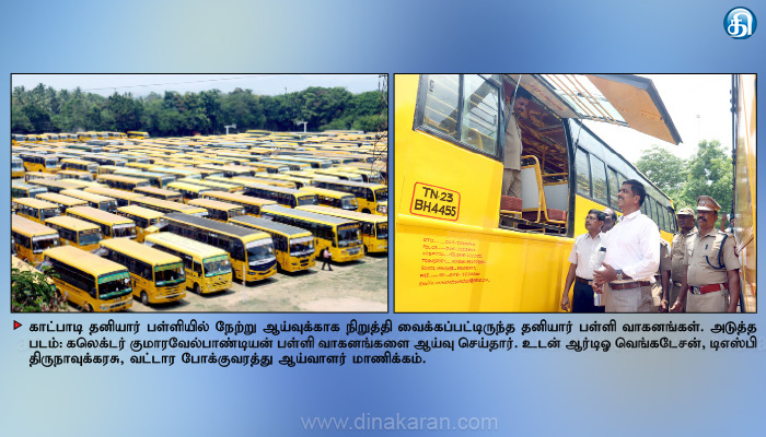 தமிழகம் முழுவதும் வரும் 1ம் தேதி பள்ளிகள் திறக்கப்பட உள்ளது. இதை முன்னிட்டு மாநிலம் முழுவதும் தனியார் பள்ளி, கல்லூரி வாகனங்களை வருடாந்திர ஆய்வு செய்யும் பணி நடந்து வருகிறது. அதன்படி வேலூர் மாவட்டத்தில் வேலூர், அணைக்கட்டு, காட்பாடி தாலுகாவில் இயங்கி வரும் தனியார் பள்ளி, கல்லூரிகளுக்கு சொந்தமான வாகனங்களை வருடாந்திர ஆய்வு செய்யும் பணி காட்பாடி சன்பீம் பள்ளியில் நேற்று நடந்தது. கலெக்டர் குமாரவேல்பாண்டியன் தலைமை தாங்கினார். வட்டார போக்குவரத்து அலுவலர் வெங்கடேசன், மாவட்ட முதன்மை கல்வி அலுவலர் முனுசாமி, டிஎஸ்பிக்கள் திருநாவுக்கரசு, பழனி ஆகியோர் முன்னிலை வகித்தனர்.