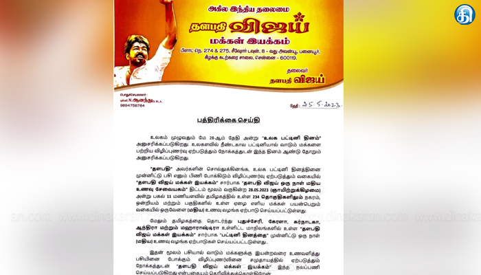 The post உலக பட்டினி தினத்தை ஒட்டி மே 28-ல் தமிழ்நாடு முழுவதும் இலவச மதிய உணவு: விஜய் மக்கள் இயக்கம் appeared first on Dinakaran.
