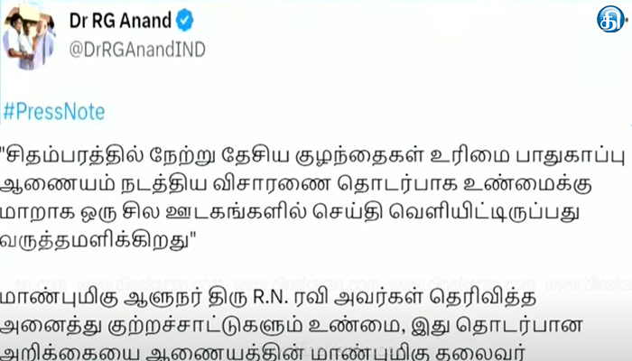 குழந்தை திருமணம் தொடர்பான விசாரணை தொடர்ந்து நடைபெற்று வரும் நிலையில் சமீபத்தில் தனியார் செய்தி நிறுவனத்திற்கு பேட்டியளித்த ஆளுநர் ஆர்.என்.ரவி குழந்தை திருமணம் தொடர்பாக சிறுமிகளுக்கு இருவிரல் பரிசோதனை நடைபெற்றதாக குற்றம்சாட்டி இருந்தார். அவரது புகாருக்கு காவல்துறை தரப்பில் மறுப்பு தெரிவிக்கப்பட்டது. ஆளுநரின் கேள்விக்கு உரியப்பதில் அளித்தும் அவர் அபாண்டமாக பொய் பேசுவதாக முதலமைச்சர் மு.க.ஸ்டாலினும் சாடியிருந்தார். இதனை அடுத்து ஆளுநர் புகார் குறித்து தேசிய குழந்தைகள் உரிமைகள் பாதுகாப்பு ஆணையமும் விசாரணை நடத்தி வருகிறது. நேற்று முன்தினம் சிதம்பரம் தீட்சிதர்கள், மருத்துவக்குழு போலீசாரிடம் தேசிய குழந்தைகள் உரிமைகள் பாதுகாப்பு ஆணைய உறுப்பினர் ஆர்.ஜி.ஆனந்த் விசாரணை நடத்தினார்.